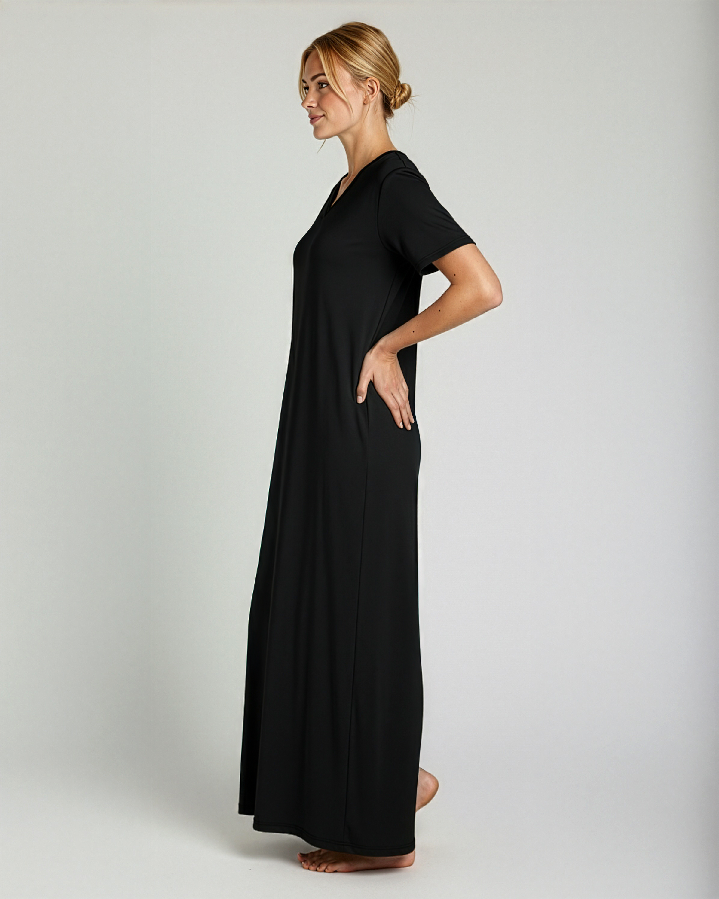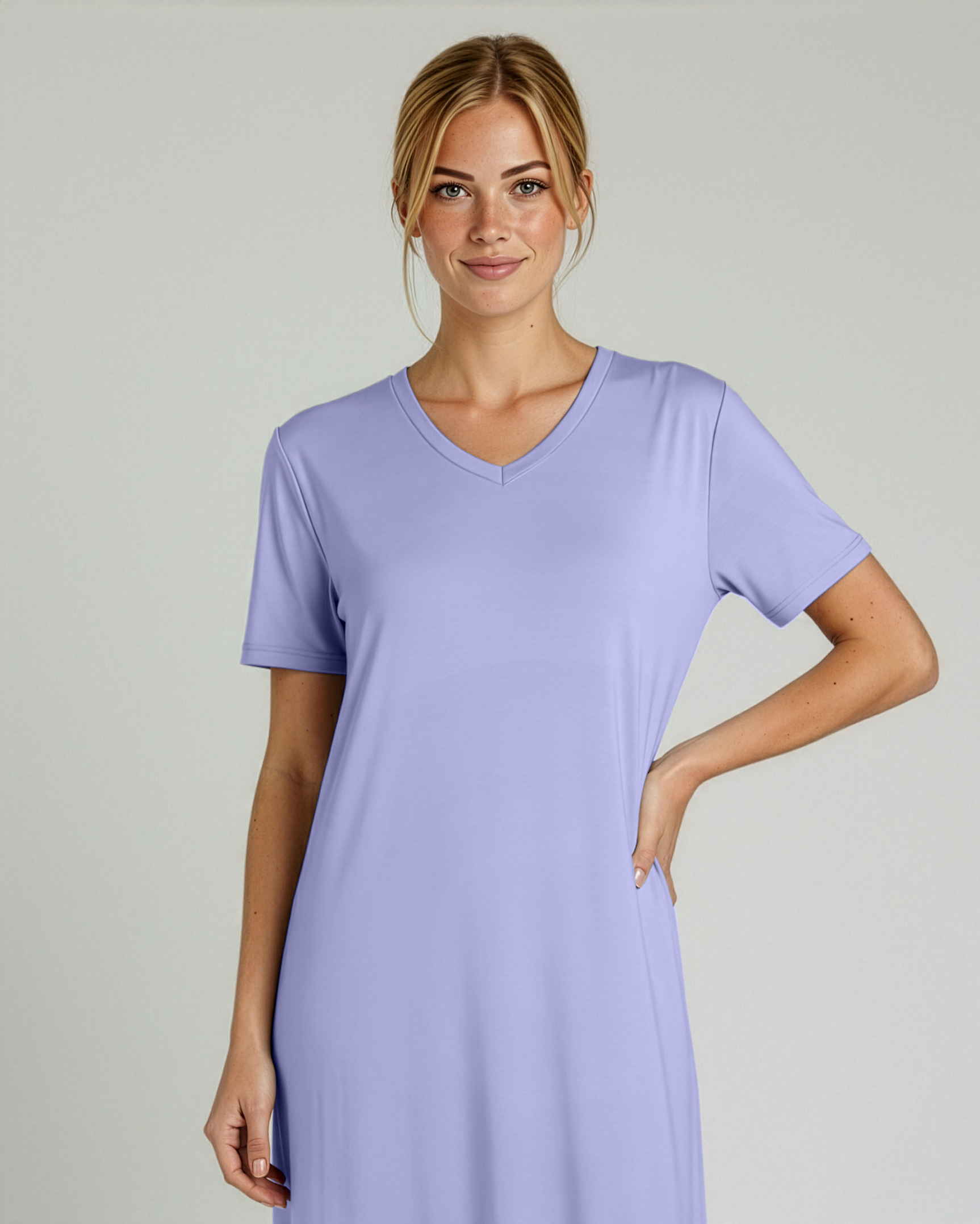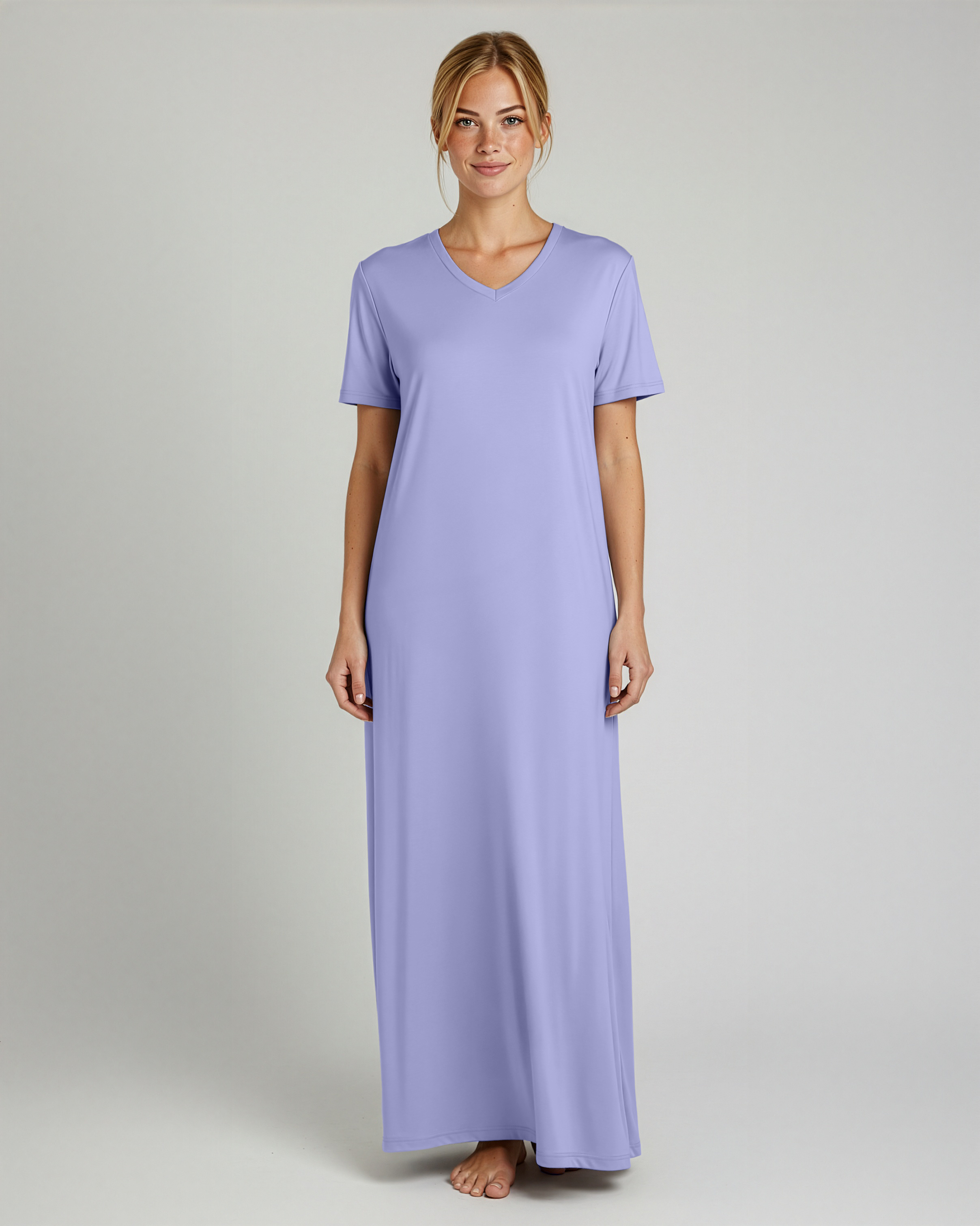 - Unlike other competitors, our Women's V-Neck Long Nightgowns are designed with a perfect combination of comfort, style, and quality. The V-neck design flatters your neckline, while the knee-length and short-sleeved style keeps you cool and comfortable all night long.