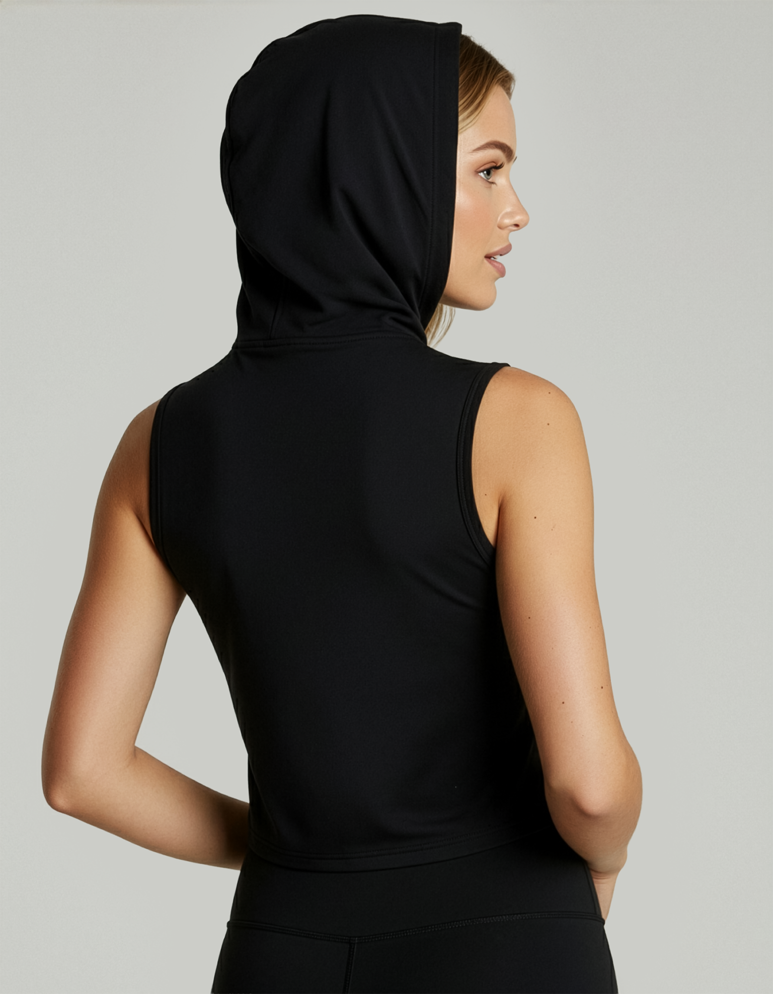 - On-Trend Cropped Design: Show off your fashion-forward side with this trendy cropped tank hoodie, designed to elevate your workout wardrobe with its chic and versatile style.